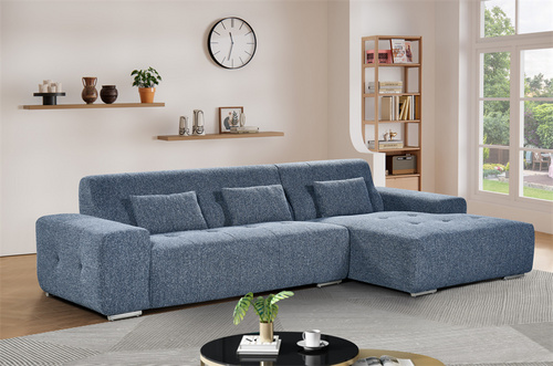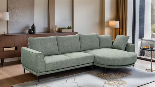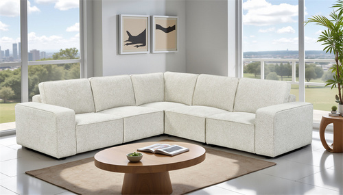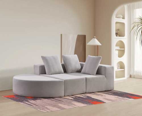 Modern modular sofa with soft, rounded shapes, backrests, armrests, and a chaise lounge