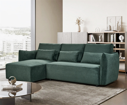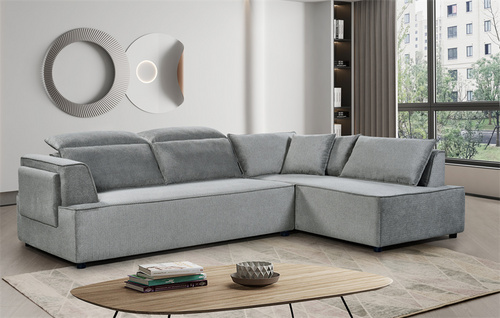 Sofa with extendable footrest, rounded armrests, and asymmetrical corner seating
